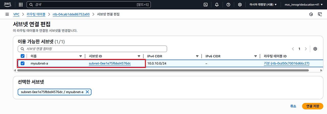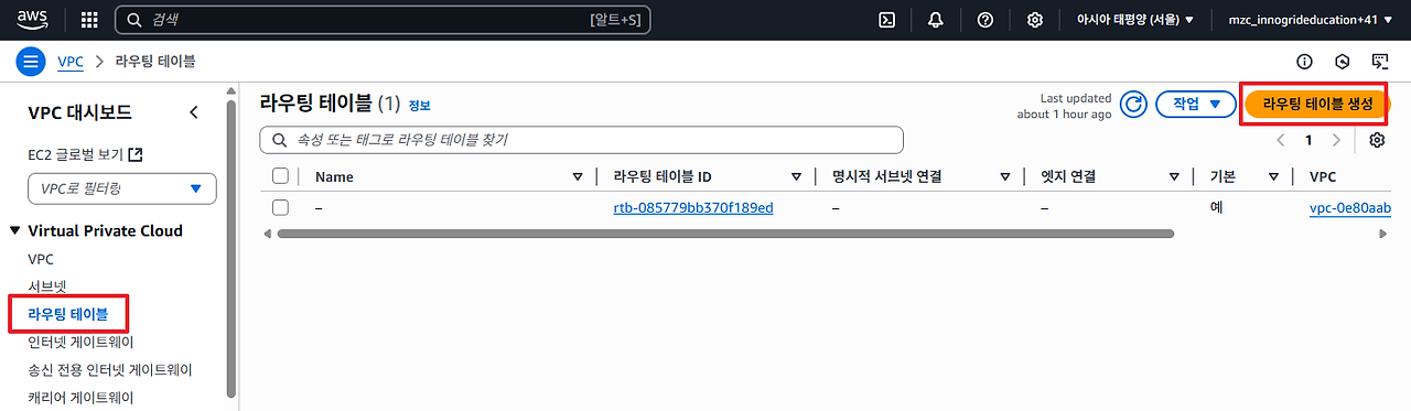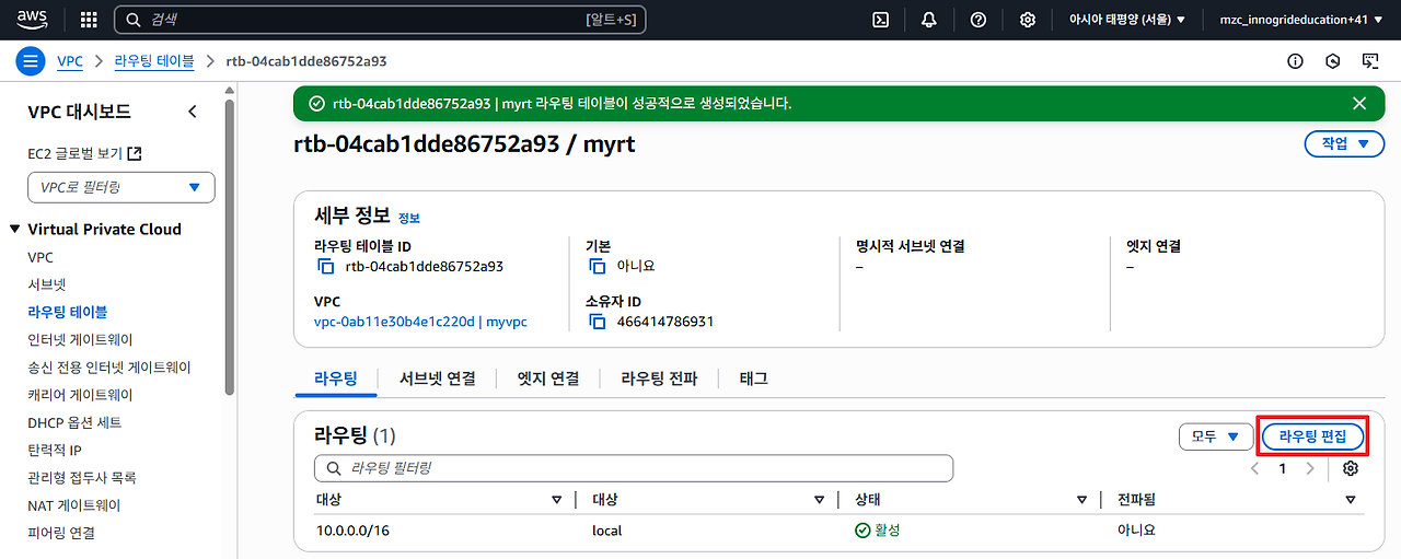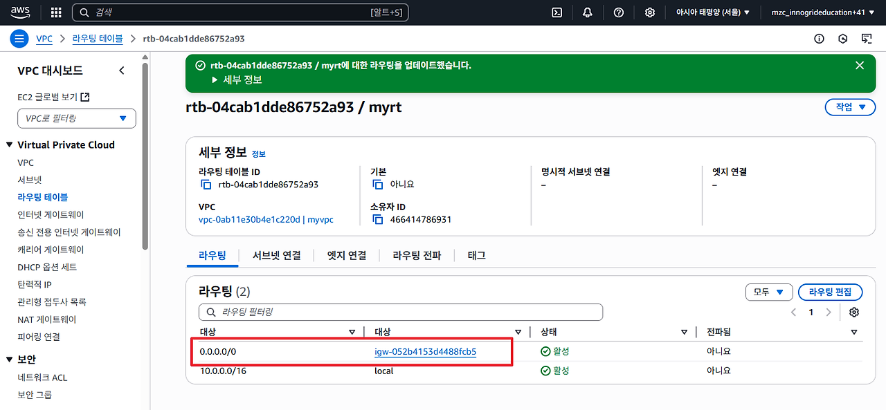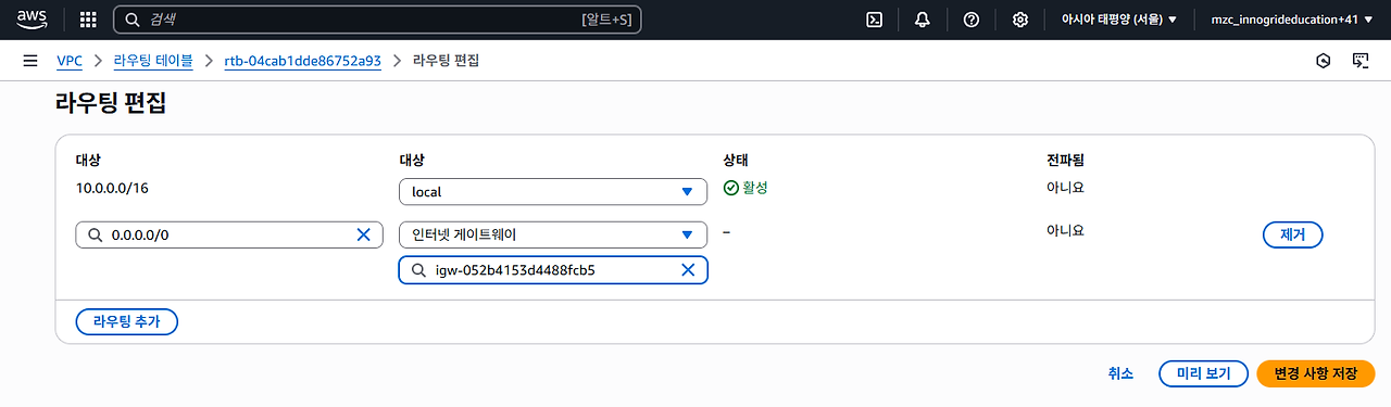 라우팅 테이블에 인터넷 게이트웨이로의 라우팅을 추가