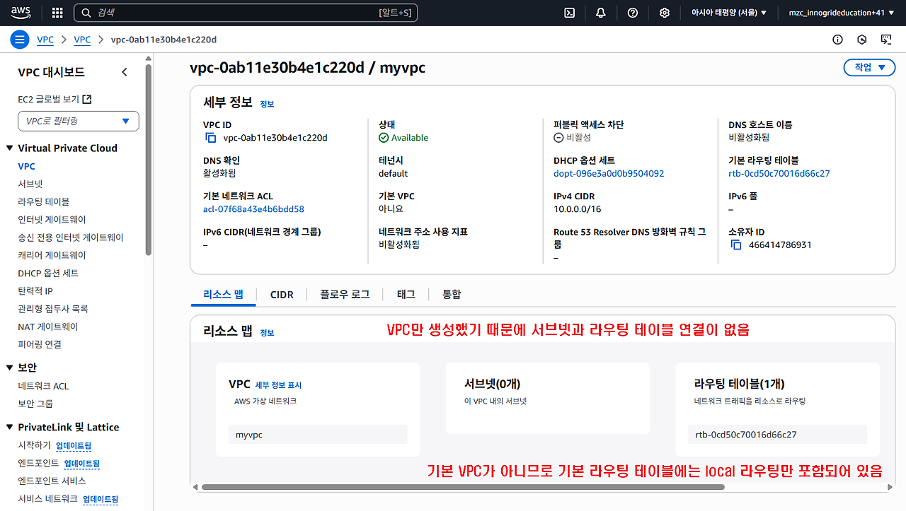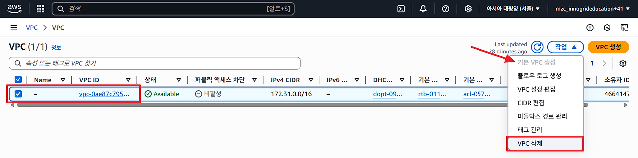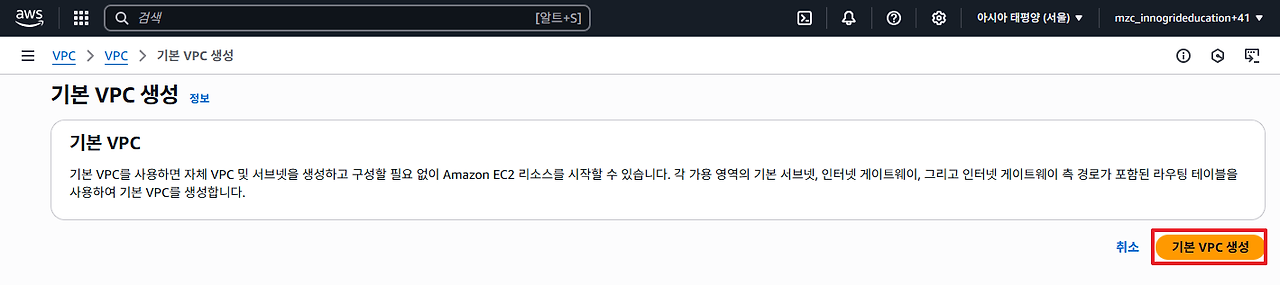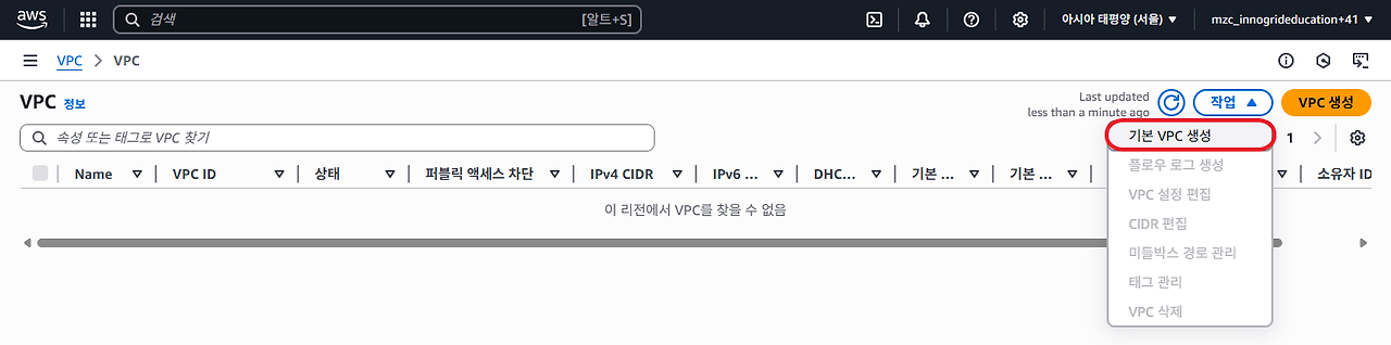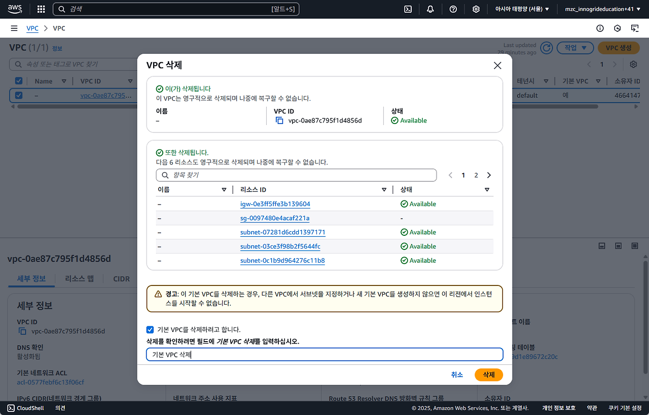 기존에 생성되어 있던 기본 VPC를 삭제한 후 기본 VPC 생성