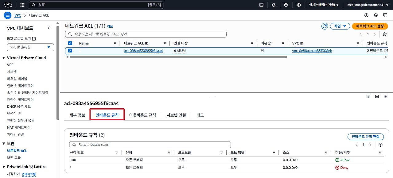 - NACL (Network ACL): 서브넷 단위의 방화벽. 비상태성으로, 들어오는 트래픽과 나가는 트래픽을 각각 설정해야 합니다. 서브넷 전체에 적용됩니다. Stateless상태(인바운드(allow)에 대한 요청 deny를 따로 설정해줘야함)