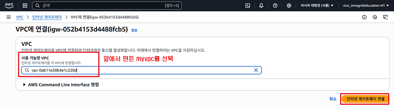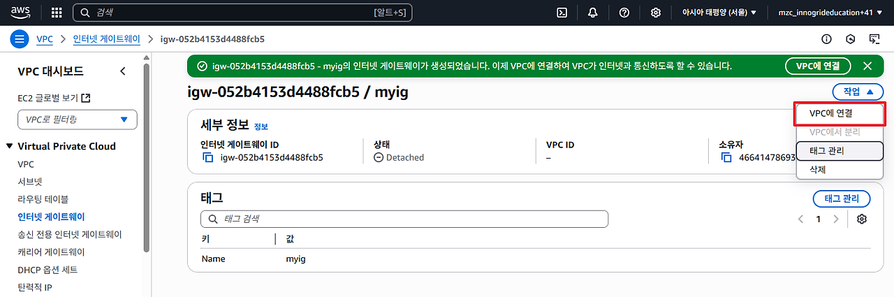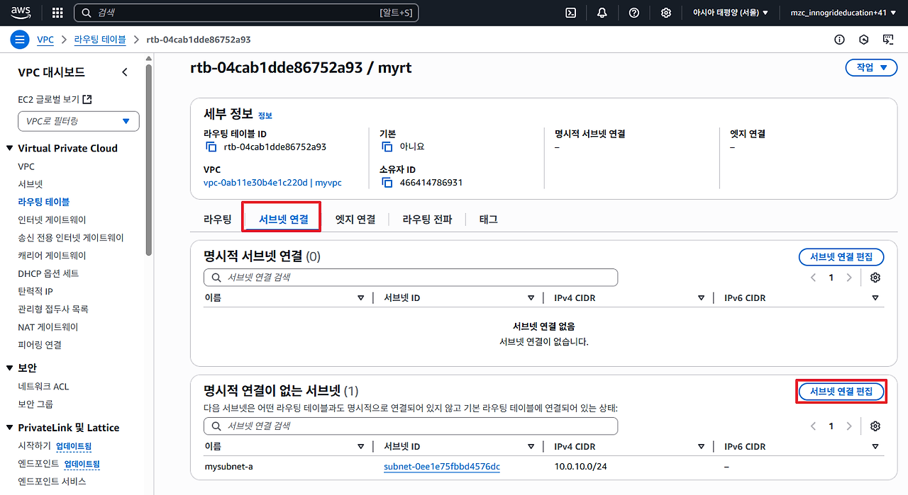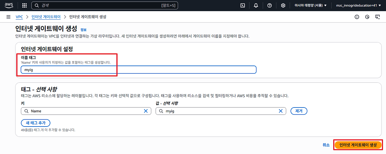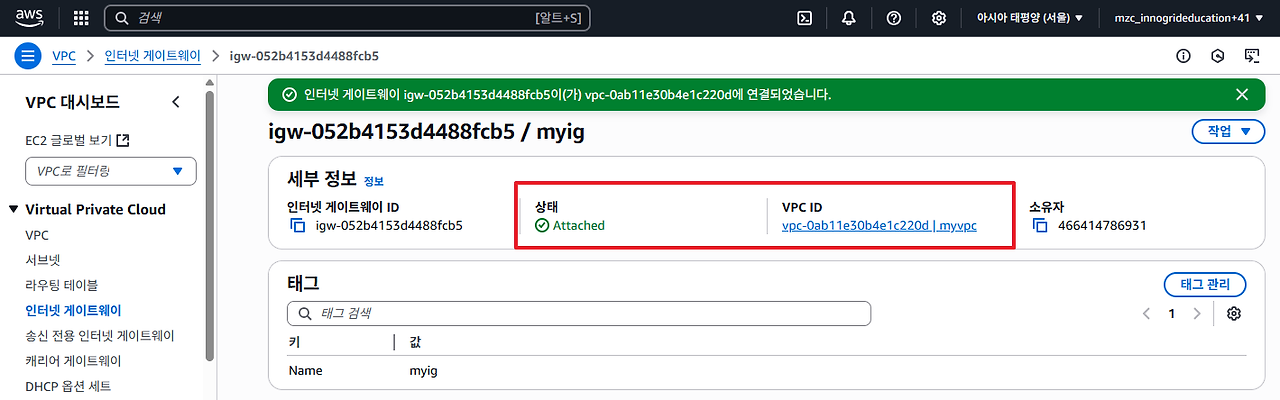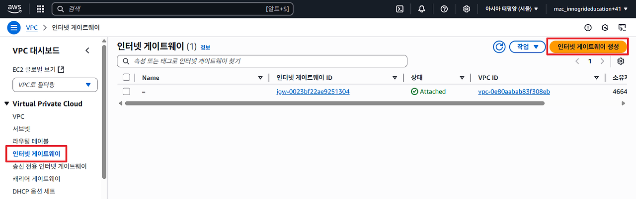 | 인터넷 게이트웨이(IGW) | VPC와 외부 인터넷 간의 연결을 담당하는 장치 |
