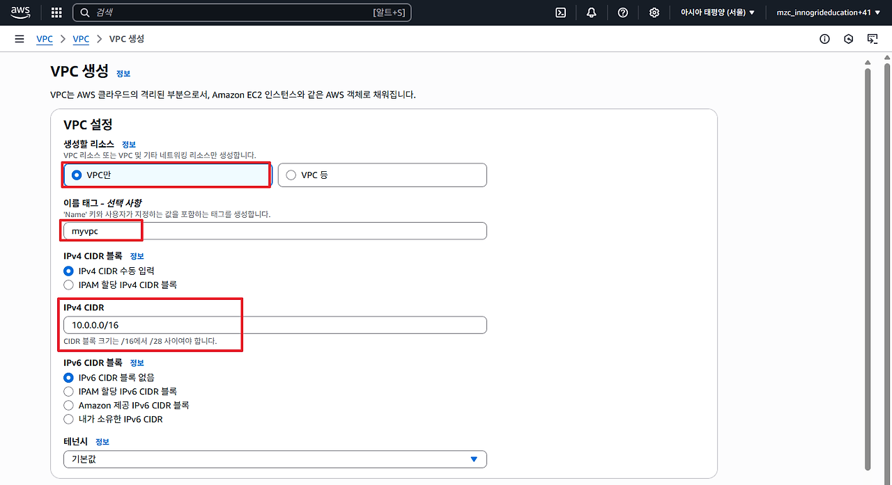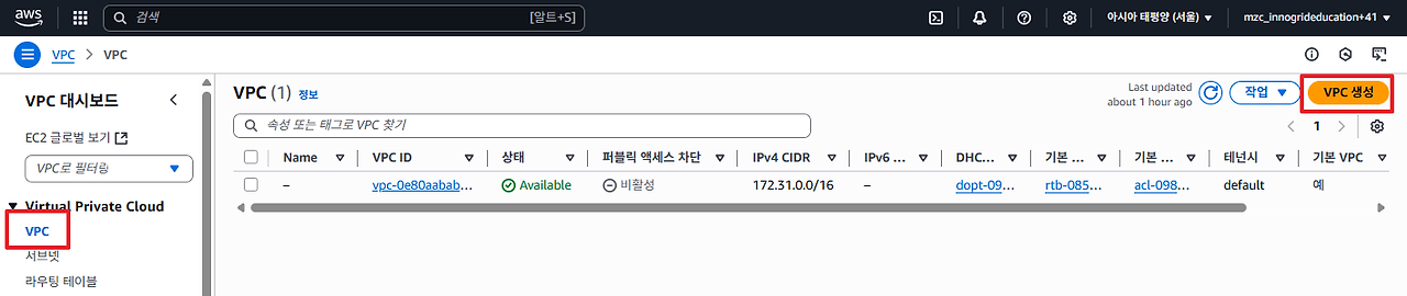 나머지 설정을 그대로 유지한 상태로 [VPC 생성] 버튼을 클릭