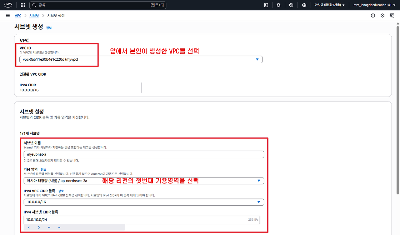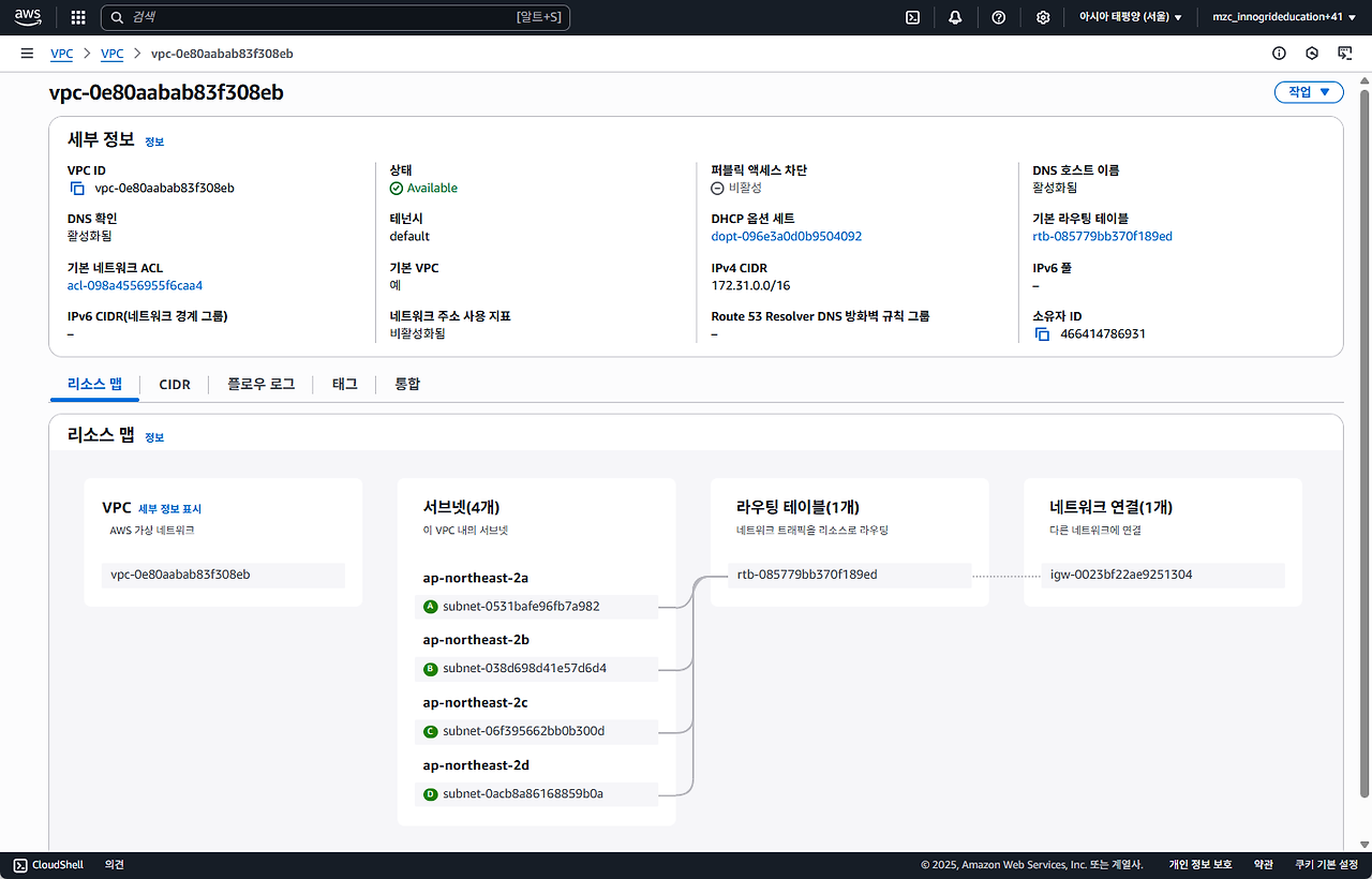 ├─ 퍼블릭 서브넷 (라우팅: 0.0.0.0/0 → IGW)