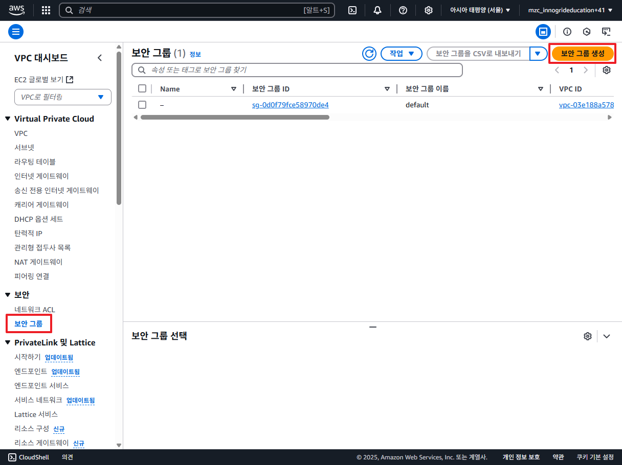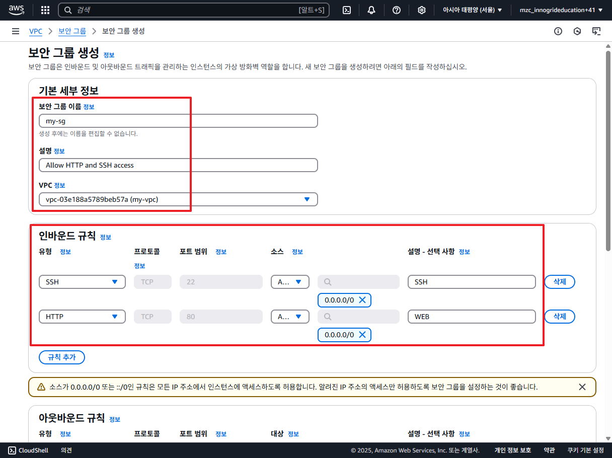 인스턴스에 적용할 보안그룹을 생성 ⇐ SSH(22), HTTP(80) 포트로 접근을 허용