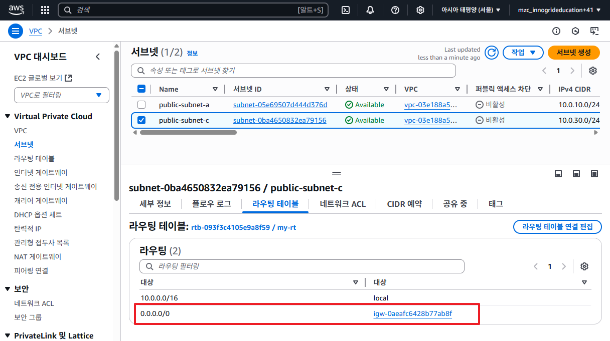 public-subnet-a, public-subnet-c 서브넷을 퍼블릭 서브넷으로 설정