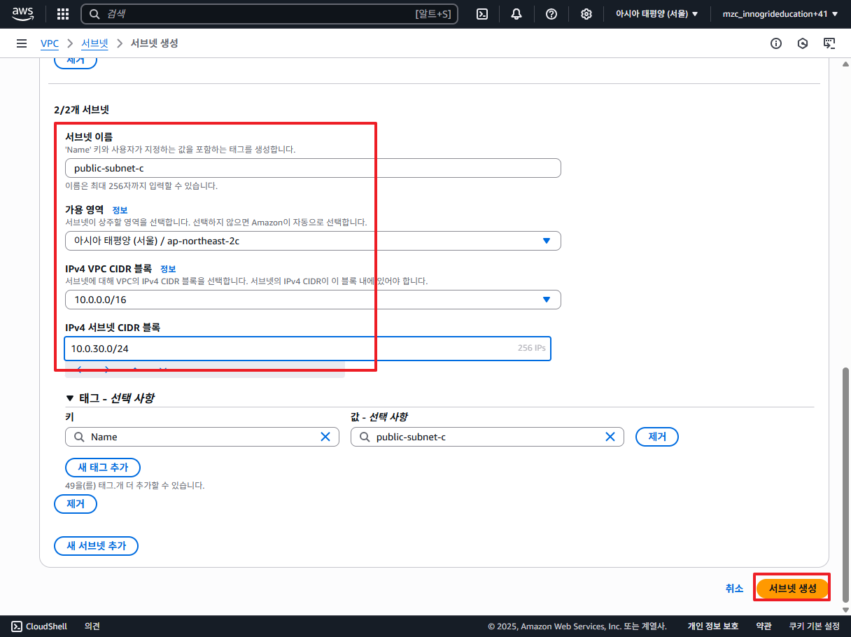 - t2.micro가 가능한 가용영역 확인 후 퍼블릭 서브넷 2개 생성
