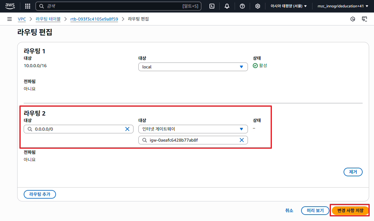 라우팅 테이블을 생성하고 인터넷 게이트웨이로의 라우팅을 추가