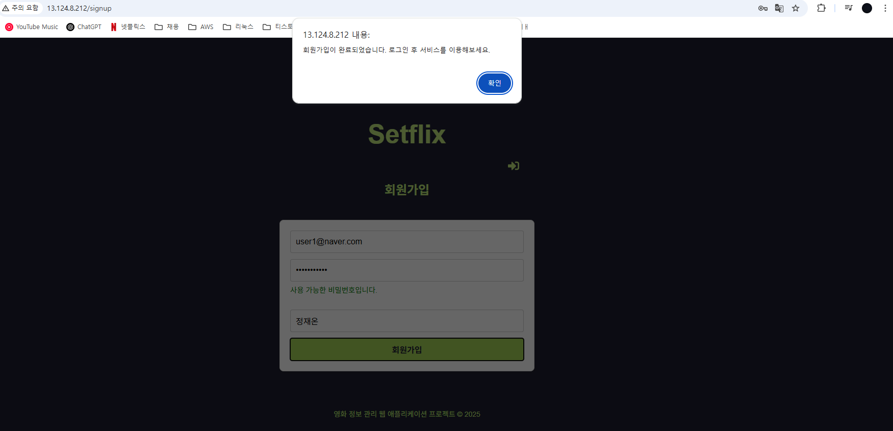 수정 후 정상적으로 회원가입 성공!
