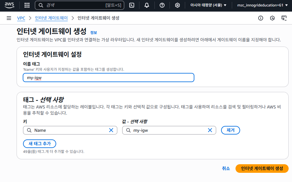 - IGW 이름: my-igw