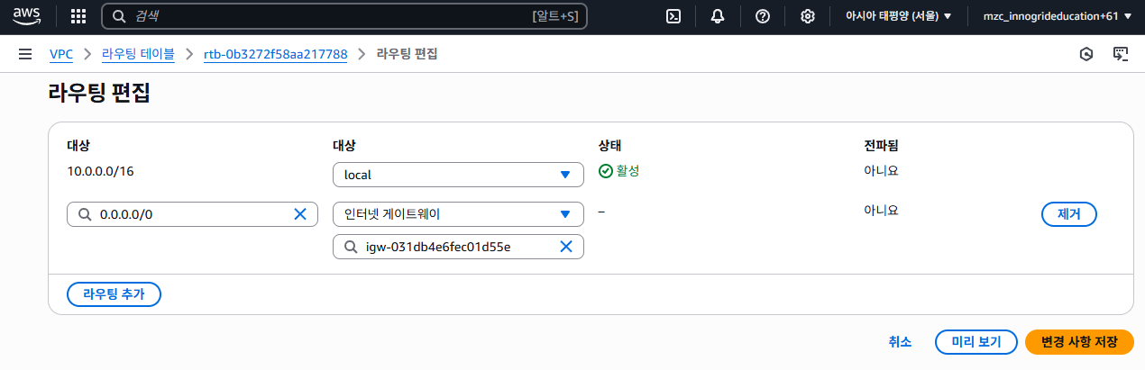 - 대상(Target): my-igw (앞에서 만든 IGW)