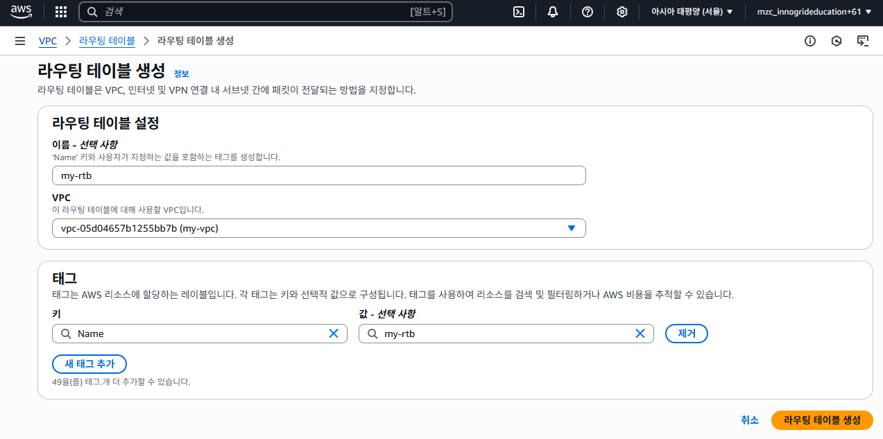 - 라우팅 테이블 이름: my-rtb