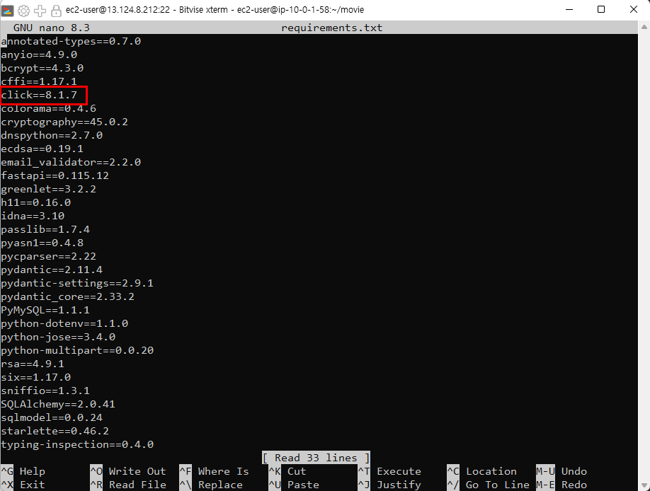 - requirements.txt에는 click==8.2.0이 명시돼 있음