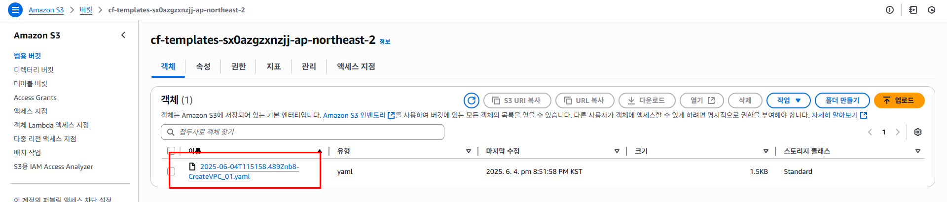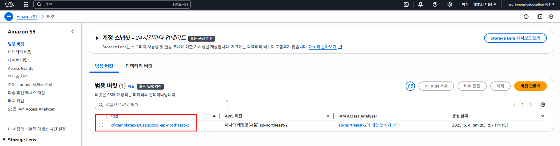 - CloudFormation 콘솔에서 템플릿 파일을 업로드하면 자동으로 S3 버킷이 생성됨