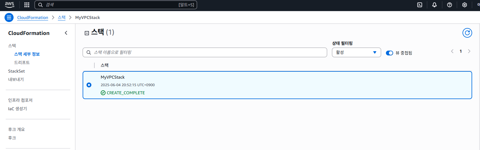 스택은 하나의 CloudFormation 템플릿에서 생성된 리소스 집합을 말합니다. 예를 들어 VPC, 서브넷, 라우팅 테이블 등이 포함된 템플릿을 실행하면 이들 전체가 하나의 스택으로 관리됩니다.