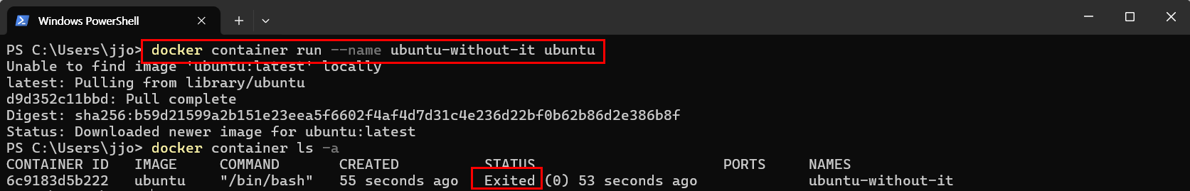 - 따라서 컨테이너는 바로 종료됨 (쉘 실행 실패)