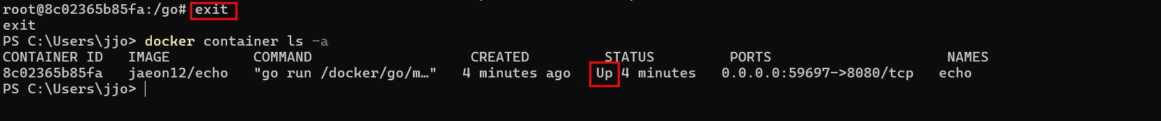 - -it 옵션으로 컨테이너 안에 연결됨 (go run main.go 실행 중)